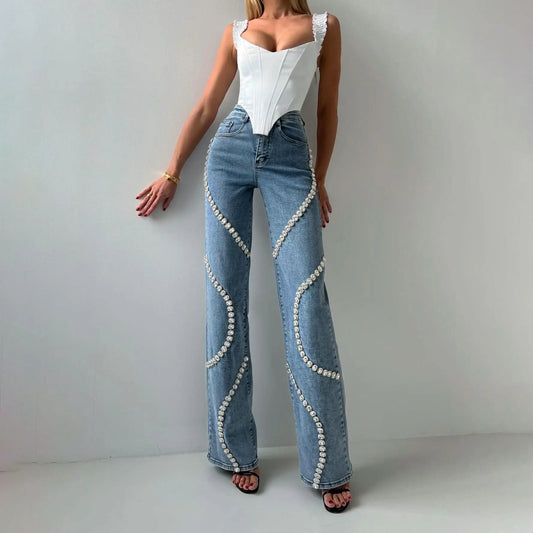 Loose Straight Leg Jeans And Fashionable Casual Pants With A Rhine Stone Denim Design Around Them Suitable For Women